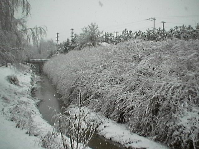The line of forsythia bushes that line the drainage channel and give